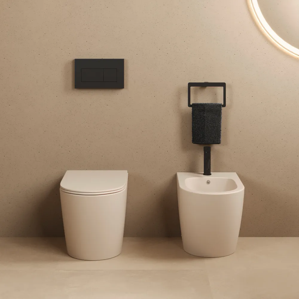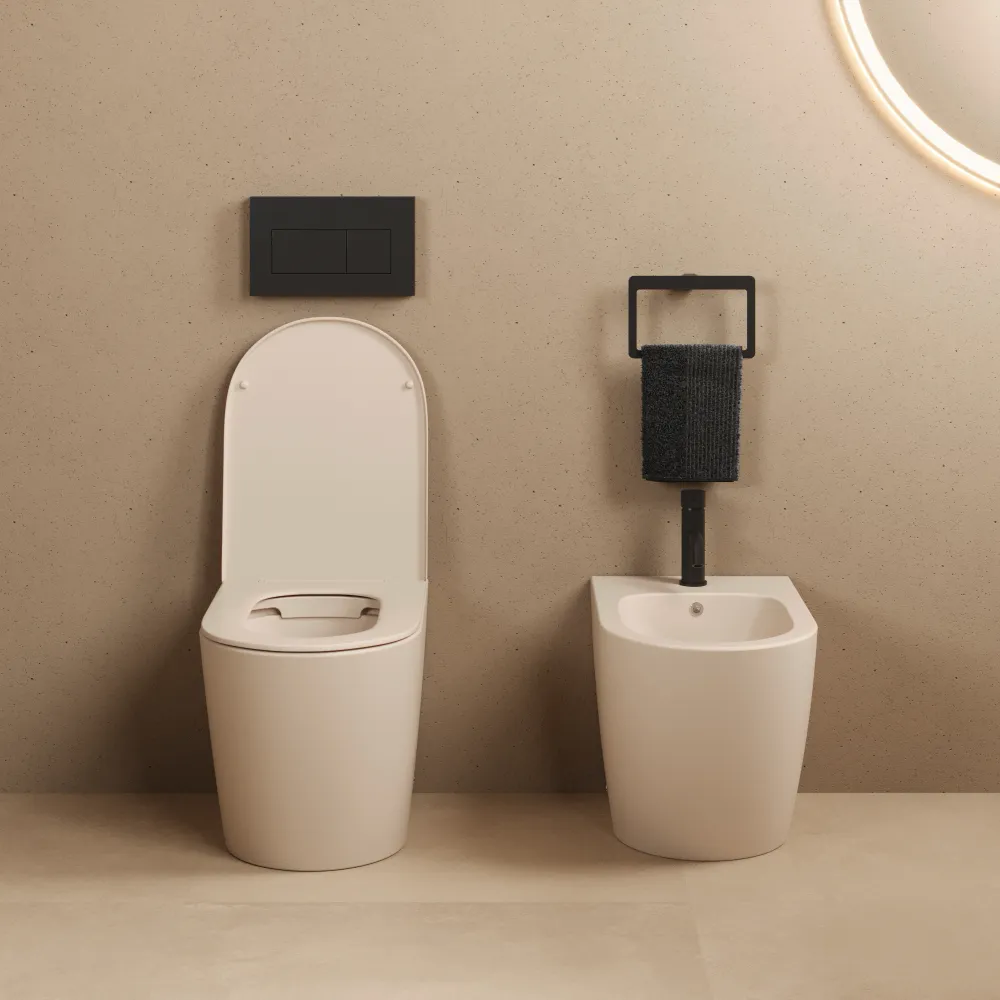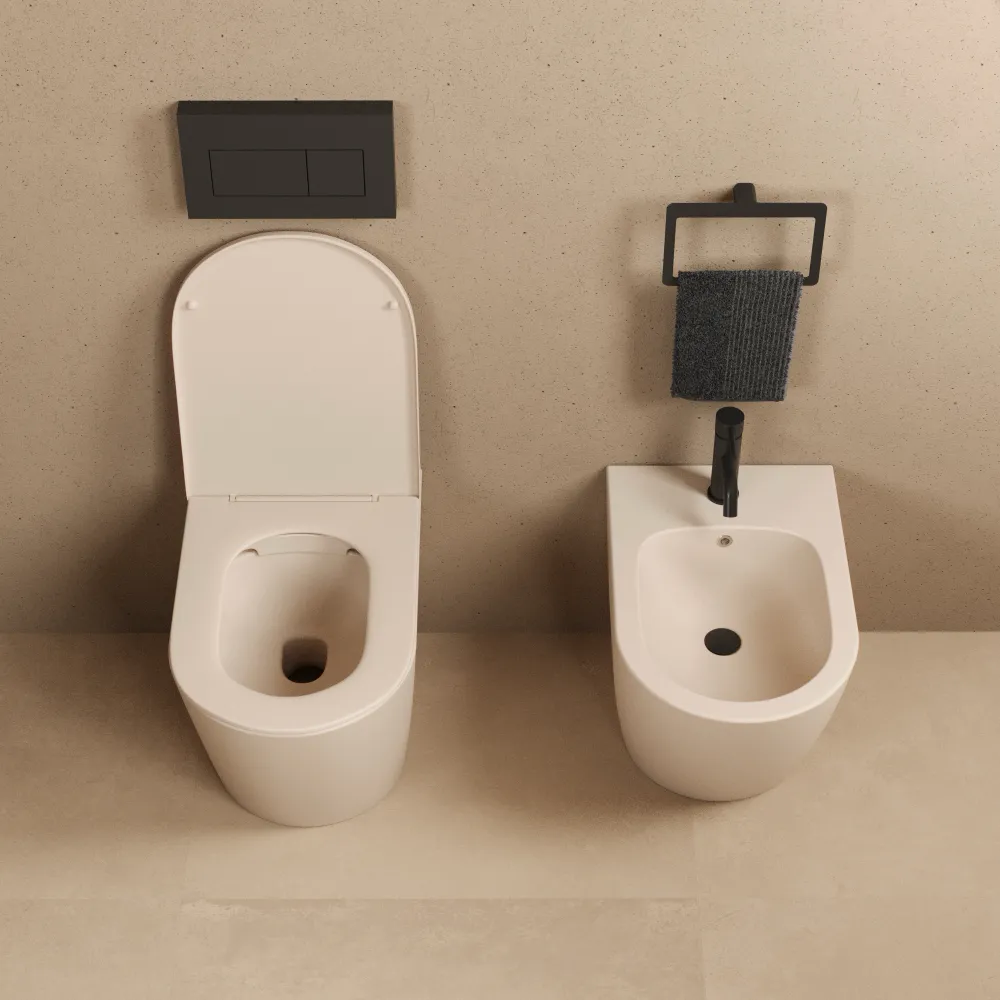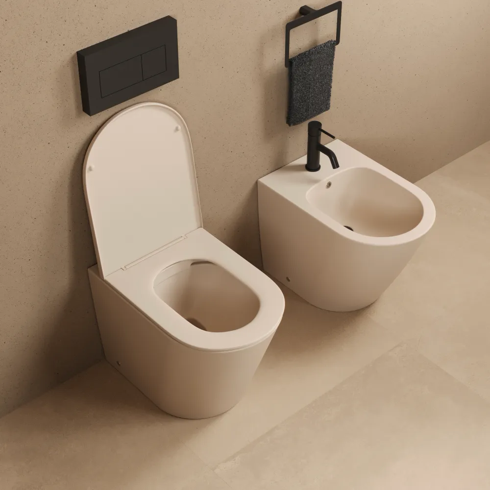 Sanitari filomuro in ceramica rimless khaki opaco: vaso, bidet e copriwc soft-close | Vienna