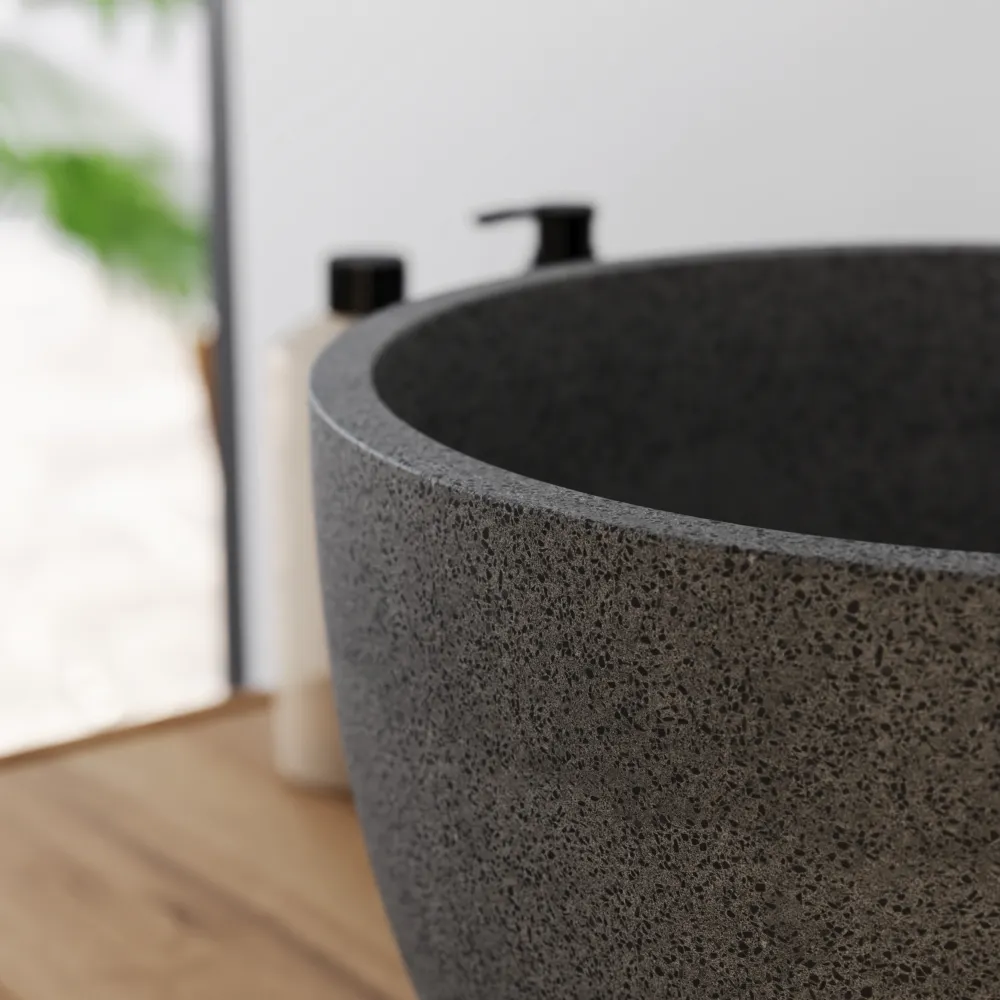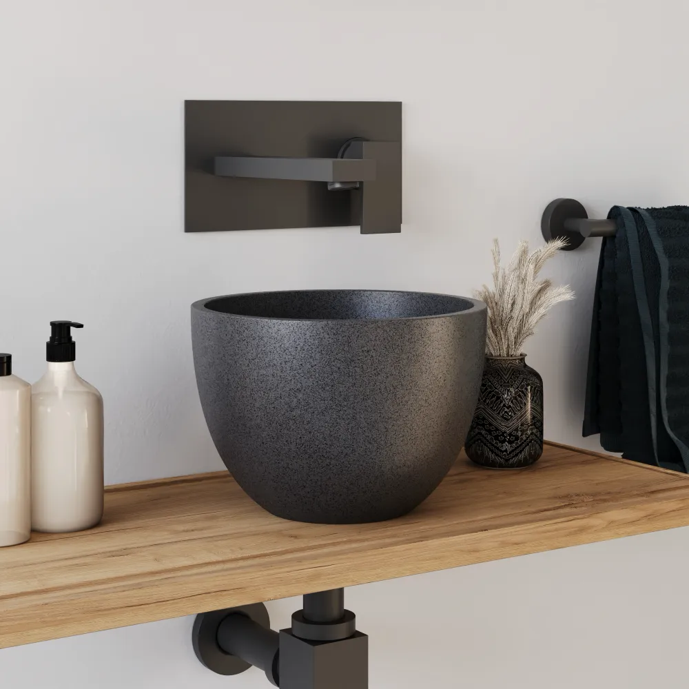 Il lavabo da appoggio Sevan è un modello compatto e di grande impatto estetico, realizzato in microcemento nero con una elegante finitura opaca effetto cemento. La sua forma tonda e il design essenziale si adattano perfettamente a bagni moderni, minimalisti o industrial chic, aggiungendo un tocco di stile sobrio e raffinato.