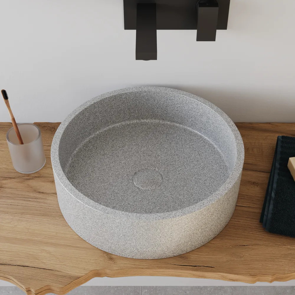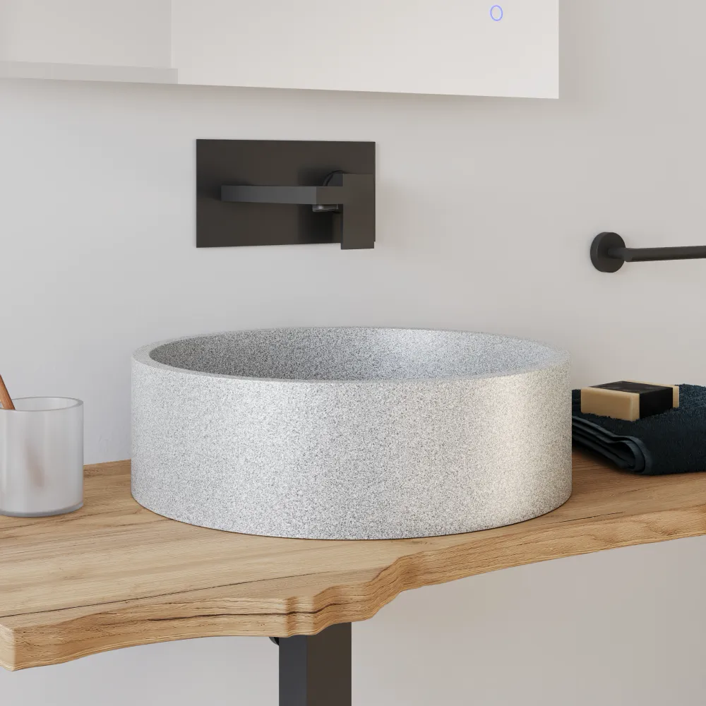 Il lavabo da appoggio Ness in microcemento beige è la sintesi perfetta tra calore materico e design contemporaneo. La forma tonda e la finitura opaca effetto cemento creano un’estetica naturale e accogliente, ideale per bagni che uniscono eleganza e comfort visivo.