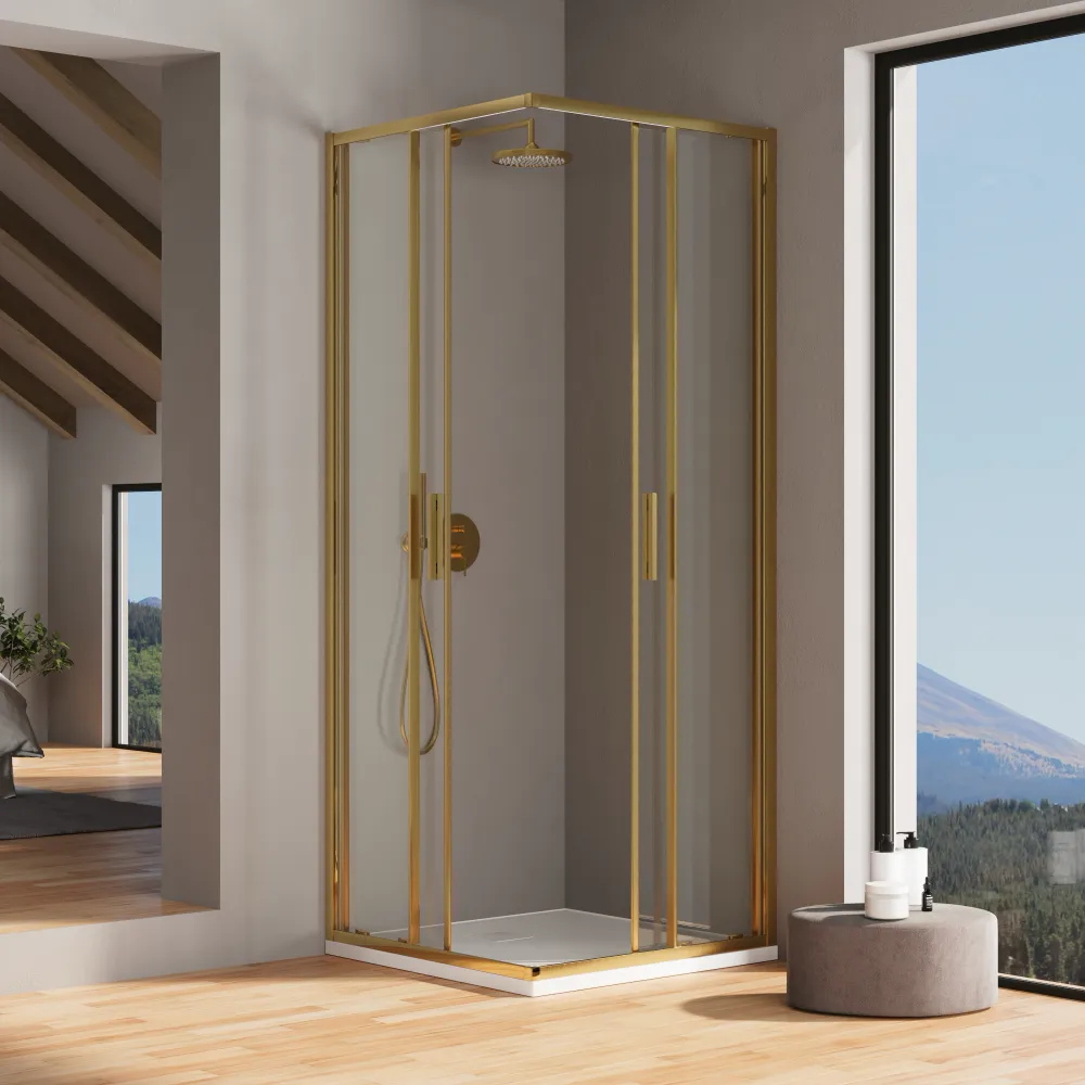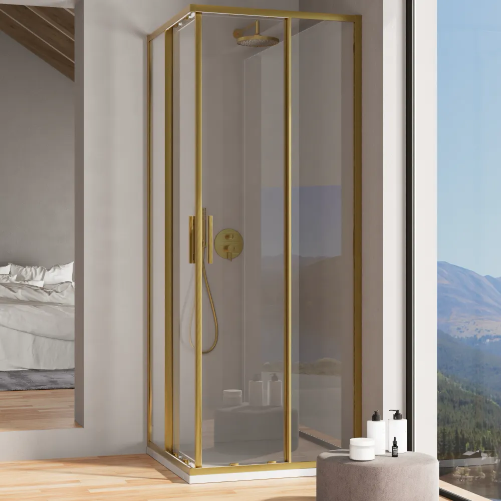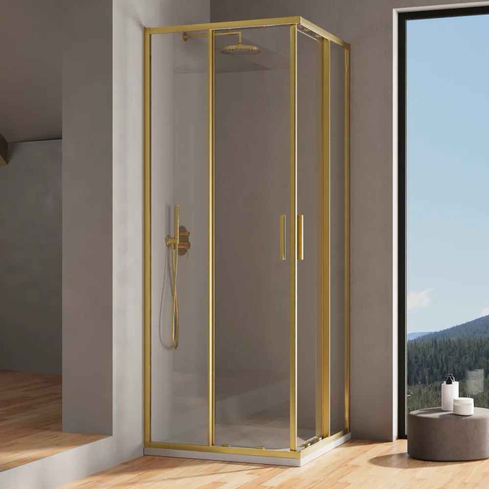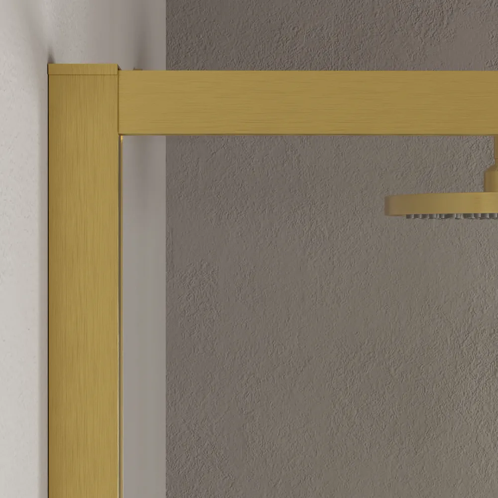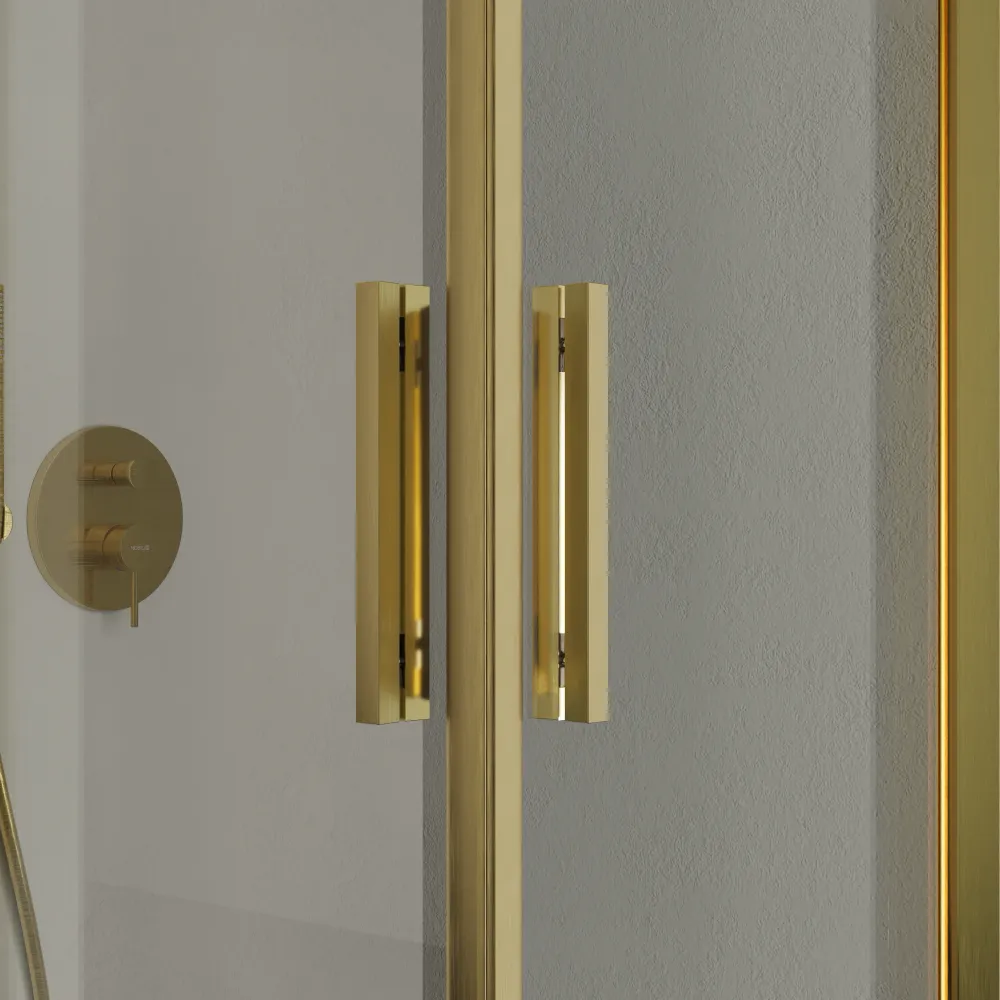 Il vetro temperato trasparente anticalcare da 6 mm offre una visuale cristallina e amplifica la luminosità del tuo bagno. La maniglia in alluminio anch'essa rivestita da una finitura oro spazzolato e dal design essenziale completa l'estetica minimalista del prodotto e garantisce una presa sicura e confortevole.