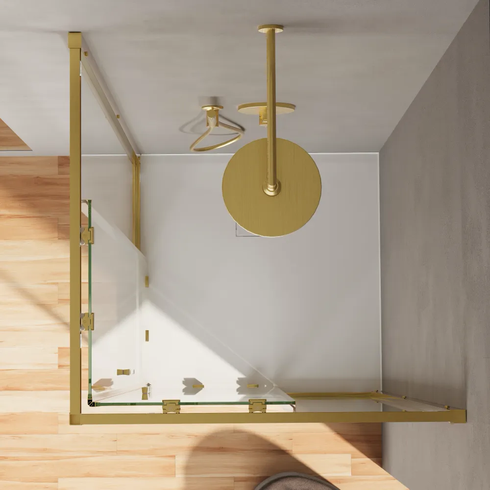 Il box doccia angolare Portofino si distingue per il suo design minimal ed elegante. I profili slim in alluminio sono i protagonisti indiscussi di questa serie e la finitura oro spazzolato conferisce al box doccia un look sofisticato e moderno, perfetto per creare un'atmosfera elegante e rilassante.