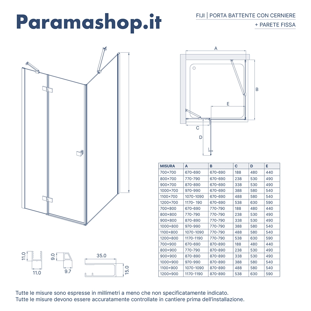 Le misure A e B, riportate all'interno della scheda tecnica, si riferiscono alla porta a battente e vengono entrambe indicate a causa della presenza delle cerniere, che creano una leggera sporgenza. La misura C, invece, si riferisce esclusivamente alla parete fissa.