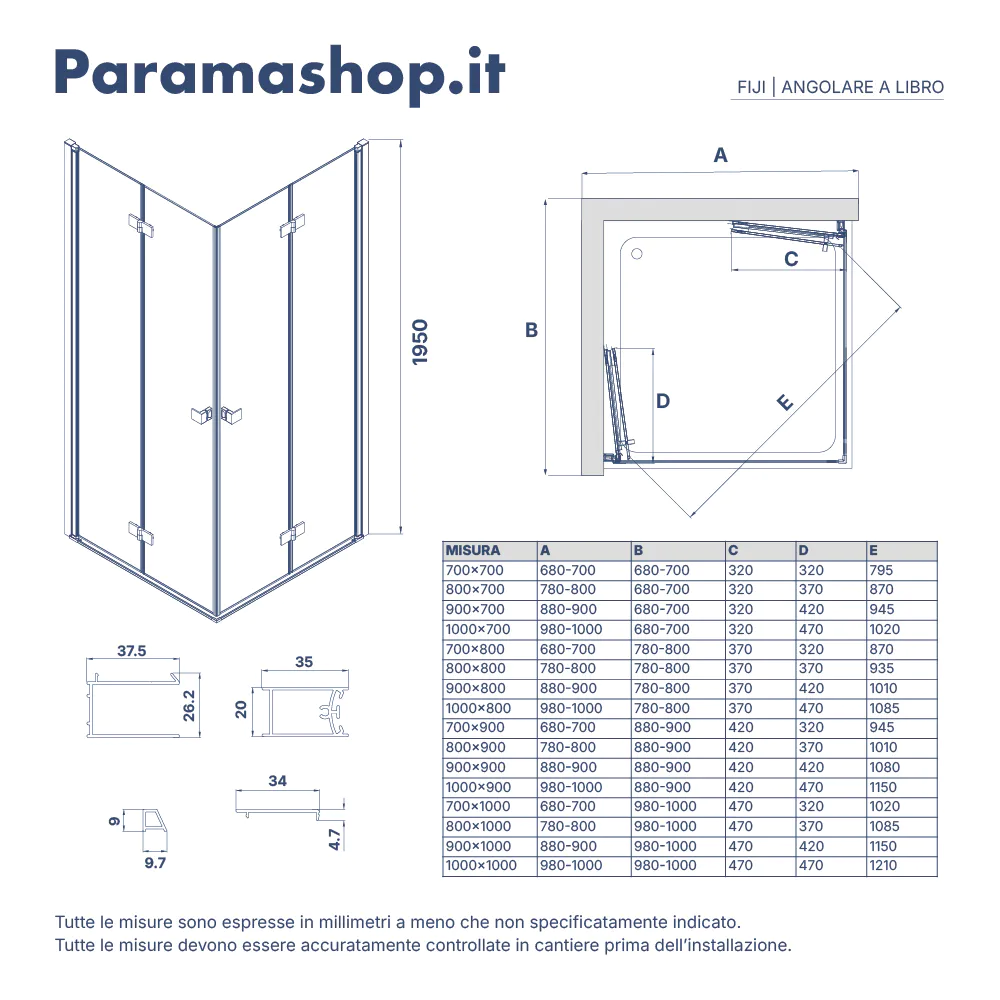 Box doccia angolare 90x70cm doppia anta a libro profili cromati e vetro da 8mm trasparente h195 | Fiji